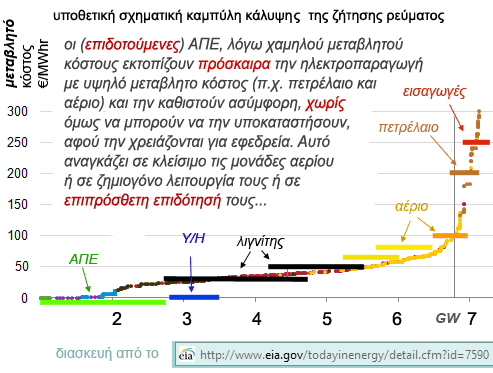 Το πρόβλημα που έχουν οι βαρώνοι, είναι το παραπάνω γράφημα. Σωστά, το σύστημα προτιμάει, σε κάθε δεδομένη στιγμή, το ρεύμα με το φθηνότερο καύσιμο (μεταβλητό κόστος), και όχι αυτό με ακριβό καύσιμο. Ένα πρόβλημα (αποκλειστικά των ΑΠΕ) είναι ότι οι ΑΠΕ έχουν χαμηλό μεταβλητό αλλά υψηλό συνολικό κόστος. Τσάμπα ο αέρας, πανάκριβα τα αιολικά (και πανακριβότερα εάν προσμετρηθούν τα συστημικά κόστη όπως έδειξε η μελέτη του ΟΟΣΑ!)