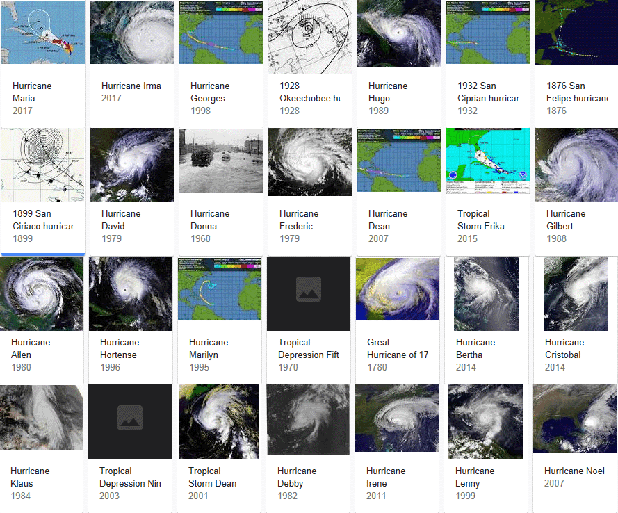Μόνο που οι καταστροφικοί τυφώνες του Πουέρτο Ρίκο είναι πολύ περισσότεροι από αυτούς που έχουν περάσει ακριβώς από πάνω του, και ένα δείγμα είναι στην παραπάνω εικόνα, από εδώ. Μα διαβάστε, τι γράφουν για τον κάθε ένα: Για την "Μαρία" του 2017: The tenth-most intense Atlantic hurricane on record and the most intense tropical cyclone worldwide of 2017 (ο δέκατος καταγεγραμμένος πιο ισχυρός τυφώνας του Ατλαντικού και ο πιο έντονος του 2017). Για τον San Felipe ή Okeechobee του 1928 (η κόκκινη γραμμή της πρώτης εικόνας): "one of the deadliest hurricanes in the recorded history of the North Atlantic basin" (ένας από τους πιο θανατηφόρους καταγεγραμμένους τυφώνες). Ο San Ciriako (Άγιος ...Κυριάκος) του 1899: "the longest-lived Atlantic hurricane on record, and the second-longest-lived tropical cyclone globally on record" (ο τυφώνας που Ατλαντικού με την μεγαλύτερη καταγεγραμμένη διάρκεια, και την δέυτερη παγκοσμίως μεγαλύτερη καταγεγραμμένη διάρκεια. Αν δεν βαριέστε, διαβάστε και για τους υπόλοιπους... Έχει και μακάβριες στατιστικές με θανάτους για τον κάθε ένα...